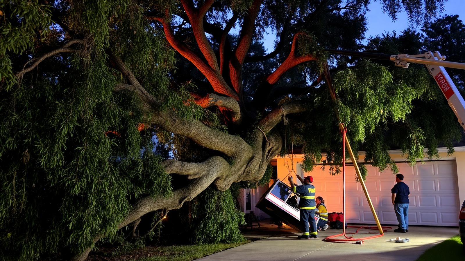 We start with an on-site assessment even during emergency response, because how the tree is positioned changes the removal plan. For trees on structures, we bring in a crane and rig the tree into lifts that come up and off, rather than dragged across the roof. For trees in open yards, we section the trunk from the top down, stack the wood, and chip the brush. For trees under tension, we make relief cuts in the right order so nothing springs back. We document everything for your insurance claim, protect undamaged property with tarps and plywood, and haul all debris. Most single-tree removals finish in half a day, though trees on houses can take longer due to the crane work.